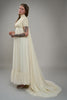 MY STORY Exquisite early 1970s silk chiffon regency inspired gown with matching detachable train. The Clara set features a high neckline, floral appliqué lace bodice with capped sleeves, a high empire waist, back zipper and a floaty two layer skirt with chiffon ruffle hem. The ruffle is double layered, giving it incredible movement as you walk. The train attaches to the back of the gown via metal clasps and fabric loops. It is double lined and features the same appliqué floral detail as the bodice. This gown is fantastical and whimsical, but also extremely elegant and timeless. It is definitely a showroom favorite.