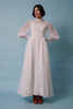 MY STORY Gorgeous 1960s chiffon gown, embroidered in a stunning daisy design. It features a high neckline trimmed in fishnet crochet, sheer insert panel around the décolleté, an empire waist with light pink ribbon cummerbund, full length chiffon poet sleeves with elongated cuffs, back zip closure and a long floaty three layer skirt. The back waistline also features a soft pink satin bow.