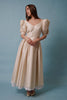 MY STORY 1980s raw silk tea length gown with the most majestic sleeves! Details include a subtle v neckline, basque waist, back zipper with pearl button embellishments and ruched half sleeves with puffed shoulders, embedded with rosettes. The skirt has three layers including an inbuilt crinoline - it is great for dancing.