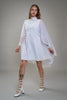 MY STORY Beautiful 1970s floaty chiffon mini dress with a fully attached chiffon cape. Details include a high neckline, back zipper, fully appliquéd bodice, an empire waist and two layer skirt. The sleeves are fastened at the cuffs with metal closures. A chiffon panel is attached at the bodice and flows out from behind the dress to create a beautiful, whimsical silhouette.