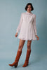 MY STORY Super cute 1960s light and flowy mini dress with waterfall train at the back. It features a high neckline, empire waist with bow detail, full length balloon sleeves with clasp closures, back zipper and a three layer skirt that has such great movement for dancing.
