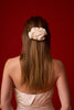 MY STORY Elegant ivory silk rosette barrette. This vintage piece attaches with a secure metal clip and is covered in ivory silk rosettes, each finished with a pearl center. A charming accessory that works beautifully on its own or paired with a veil for added romance.