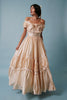 MY STORY This gown is so special - it is from the early 1980s and is made from the softest, most exquisite silk we have ever felt. It features a scooped neckline that can be either worn on or off the shoulders, a natural waistline, waist belt loops, back button closures and a full five layer skirt with inbuilt crinoline (worn with additional crinoline in the pictures). The neckline and skirt tiers are embellished with silk ruffles, embroidered lace and bows.