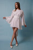MY STORY Gorgeous late 1970s white chiffon three piece set including a mini dress, detachable belt and shawl. The dress features an open neckline, an elasticated waistband, back zipper, floaty two layer skirt and oversized bell sleeves embellished with floral appliqué lace and iridescent beads. The belt ties around the waist and can be fashioned in a bow. The shawl is trimmed in the same appliqué and beading as the dress.